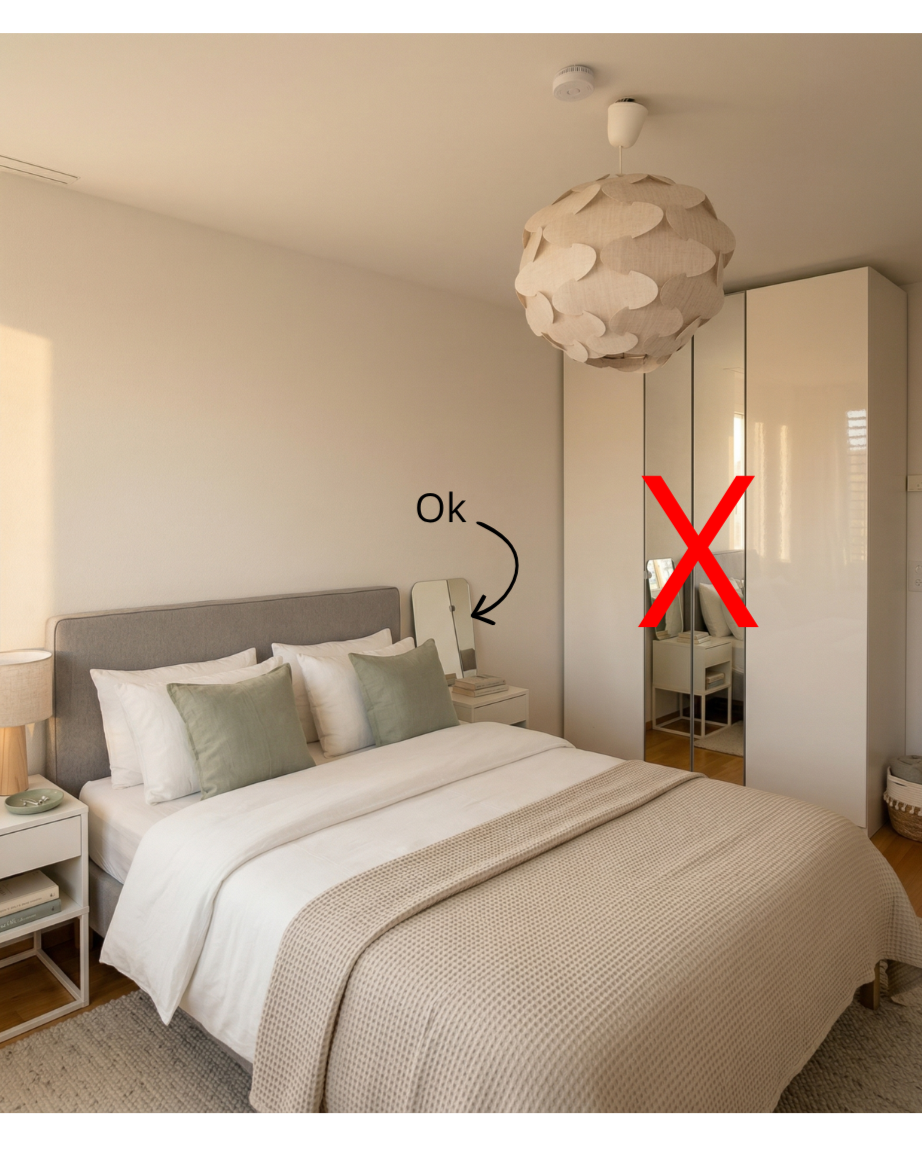 Stand at your bedroom door and look toward the bed. Is there a mirror — a wardrobe door, a full-length panel, a decorative piece — that reflects your sleeping body? If yes, it's worth addressing. In Vastu, mirrors are considered energetically active: they reflect and amplify whatever is in front of them, keeping energy in constant movement. In a bedroom, that's exactly the opposite of what you want. The room is meant to hold and restore, not activate. There's something older here too — many traditions, not just Vastu, share an instinctive discomfort with mirrors in sleeping spaces, and that's not coincidence. Cover the mirror at night with a piece of fabric, or reposition it so it faces a wall instead. It sounds like a small thing. Some clients describe the room feeling noticeably quieter after, more contained — like it finally settled.