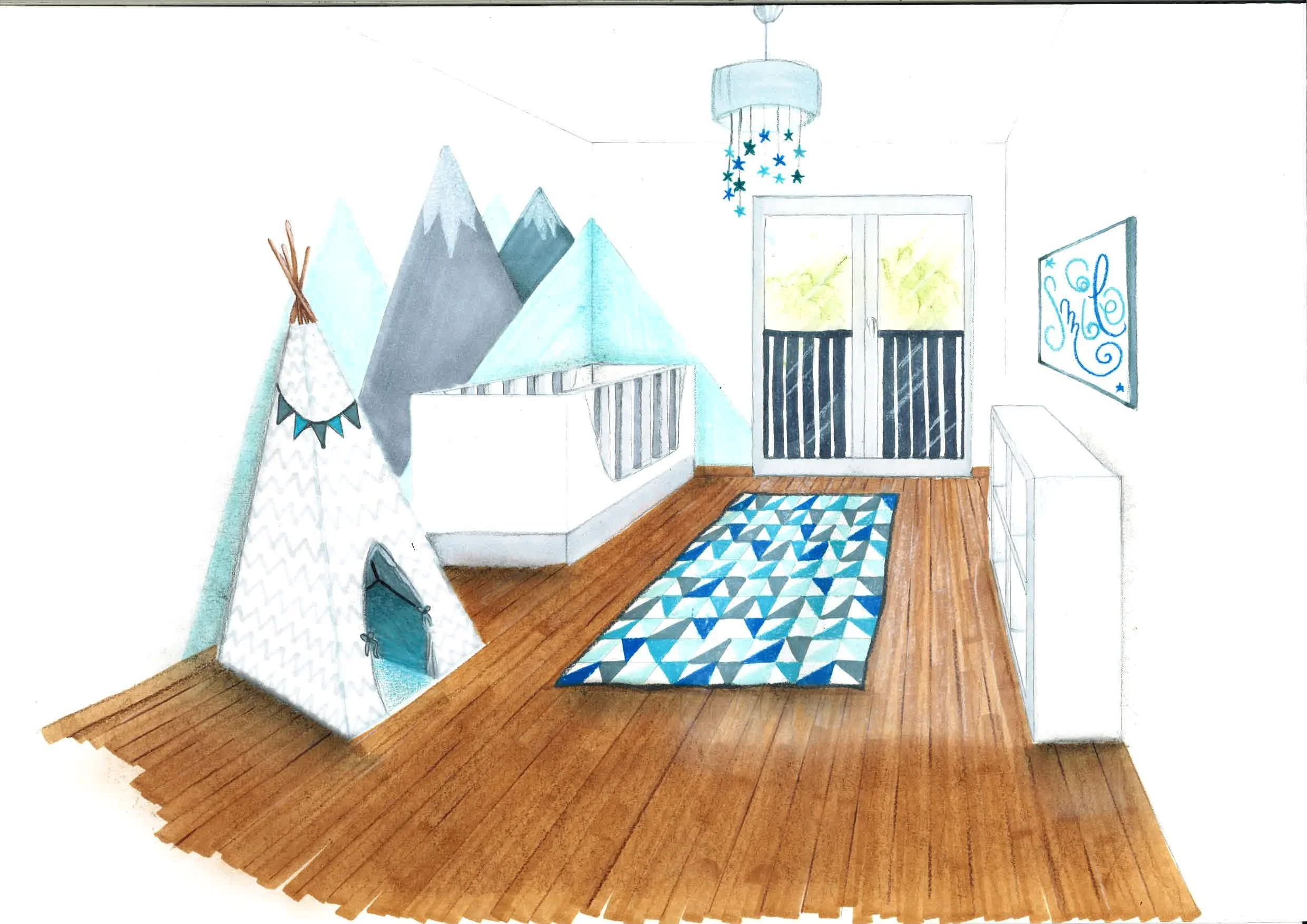 During my interior design studies, we had a drawing class where we were asked to imagine a project and develop it through sketches for our academic portfolio. At the same time, I was pregnant in the final year of my course. Naturally, I chose to design my son’s nursery.